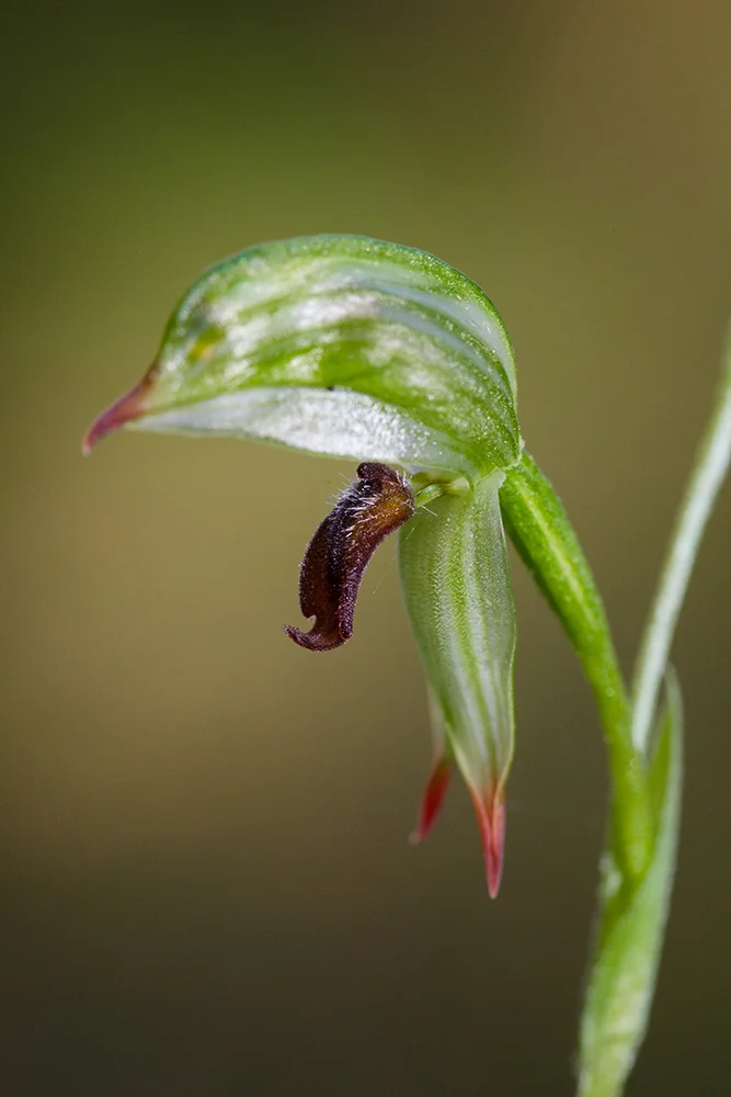 The anatomy of Pterostylis chlorogramma. The labellum (the brownish red hairy bit) flips upwards when disturbed, trapping the insect in the hood (the top rounded bit). The insect crawls from right to left inside the hood before it is able to escape.